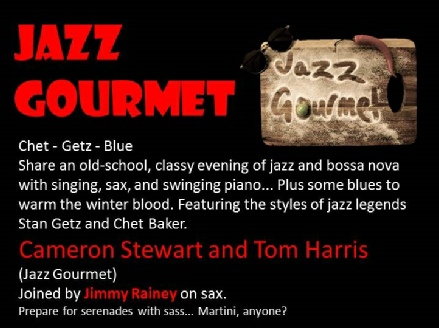 Cameron Stewart and Tom Harris (Jazz Gourmet) will be joined by Jimmy Rainey on sax.