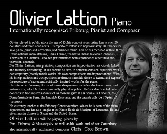 Internationally recognised Fribourg Pianist and Composer Olivier playing pieces by Pärt , Debussy & Mussorgsky as well as his work and of our Canterbury, also internationally acclaimed composer Chris Cree Brown.