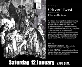 Scenes from the original Oliver Twist as written and read aloud by Charles Dickens A selection of readings from Dickens's moving tale showing how the so-called Oliver Twist escapes a life of poverty and crime. The grimness and hypocrisy of nineteenth century London and its nearly fatal effect on a lost young orphan is relieved by a curious set of circumstances and coincidences. In spite of an almost overwhelmingly bleak picture, unhoped for and unexpected human kindness saves the day. A case of "Who do you think you are?“ Read by Margaret Copland, well known for her solo dramatic monologues and readings & Don McAra a former educational drama teacher ,director and actor, before becoming a full time professional visual artist. |