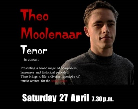 Theo Moolenaar Tenor and Marco Taiaroa Theo Moolenaar Tenor Presenting a broad range of composers, languages and historical periods, Theo brings to life a diverse repertoire of music written for the tenor voice. Also featuring Marco Taiaroa a selection of singing duets accompanied by Marco’s guitar playing . |
