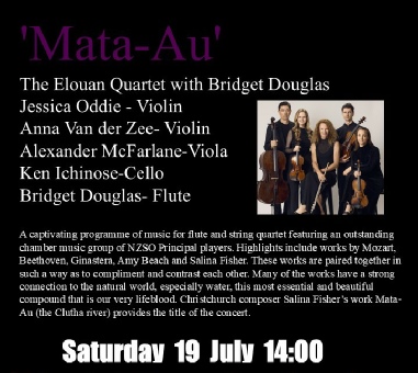 A captivating programme of music for flute and string quartet featuring an outstanding chamber music group of NZSO Principal players. Highlights include works by Mozart, Beethoven, Ginastera, Amy Beach and Salina Fisher. These works are paired together in such a way as to compliment and contrast each other. Many of the works have a strong connection to the natural world, especially water, this most essential and beautiful compound that is our very lifeblood. Christchurch composer Salina Fisher’s work Mata-Au (the Clutha river) provides the title of the concert.