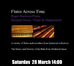 Flutes Across Time Roger Buckton-Flutes Richard Oswin - Piano & Harpsichord A variety of flutes and recorders from historical collection. The Music and History of the flute from Medieval times. |